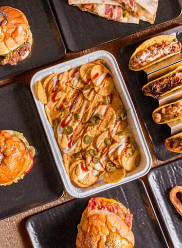 con carne e fagioli, assaggio misto di jalapeno Mexico e 5 salse barbecue, cheddar, guacamole, messicana e ranch